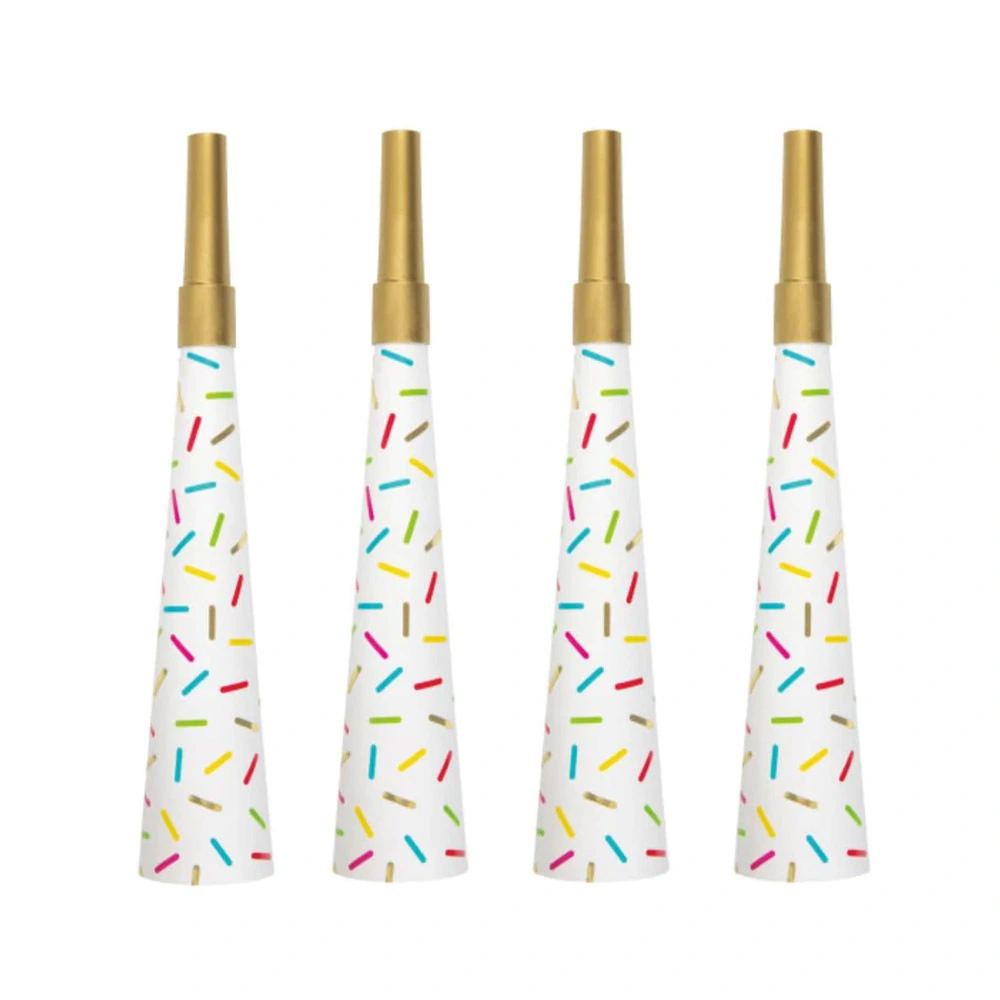 Includes 4 Confetti Print Gold Horn High Quality Perfect for theme parties, masquerade parties, birthday parties, graduations, and wedding parties Can be placed in goodie bags with other treats and party favours. Coordinate with other party supplies and party favours