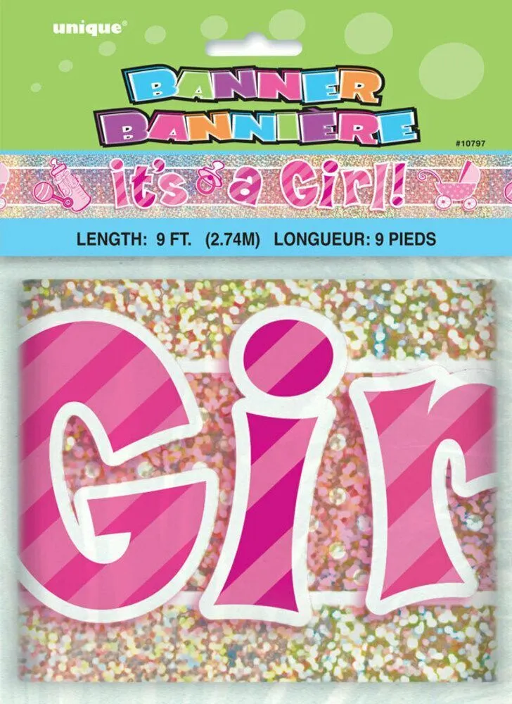 This Banner is a great way to add some festive decoration to a birthday party! It can help set the tone and create a fun atmosphere for the celebration. Includes 1 It’s a Girl Prismatic Banner Measures 2.7m High-Quality Great for birthdays and baby showers
