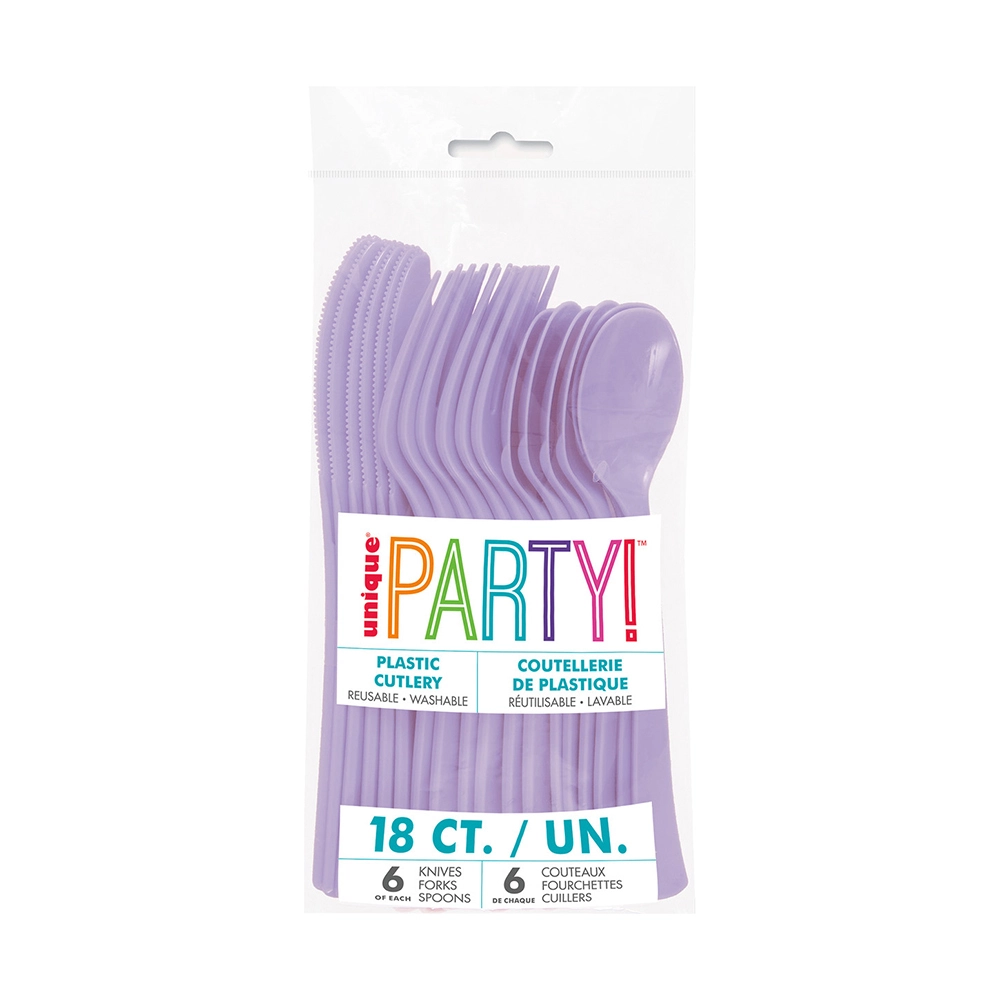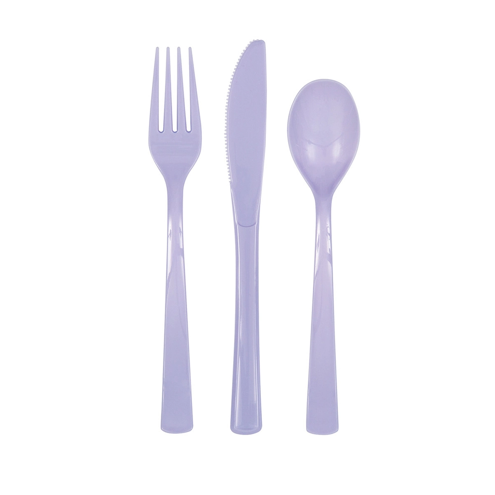 Includes 18 Lavender Cutlery Contains: 6 x spoon 6 x fork 6 knife High-quality Perfect accessory for your theme parties Coordinate with other Birthday party supplies and party decorations