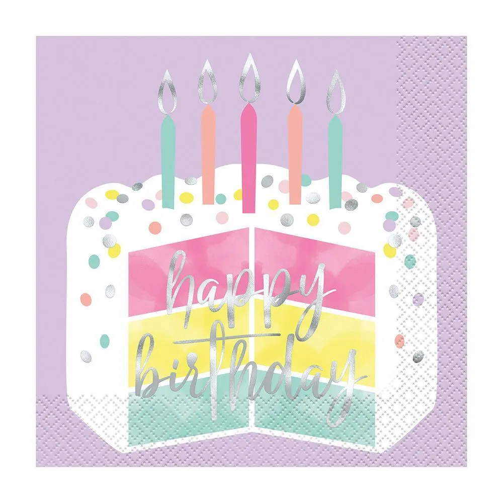 Unique Pastel Cake “Happy Birthday” Foil Stamped Luncheon Napkins 2ply 16 Pack