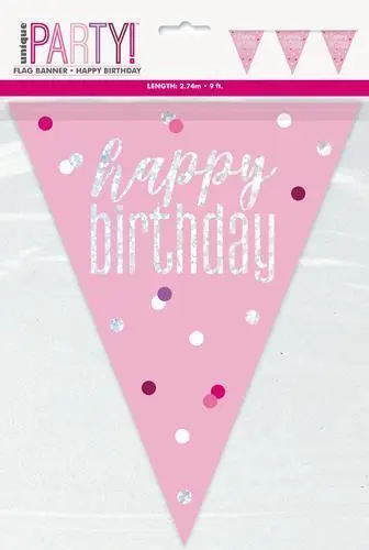 Unique Pink Prismatic Foil Flag Banner – Happy Birthday 2.74m