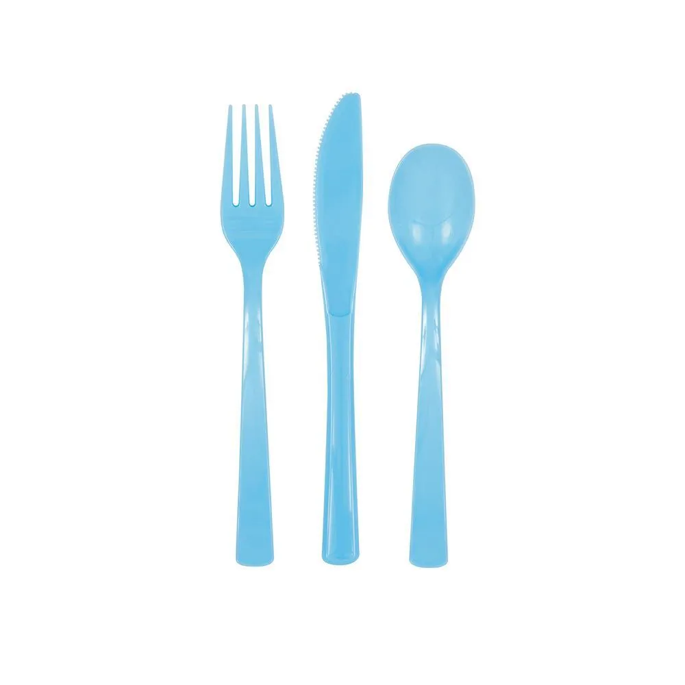 Includes 18 Powder Blue Assorted Reusable Cutlery Set includes 6 spoons, 6 knives, and 6 forks High-quality Perfect accessory for your theme parties Coordinate with other Birthday party supplies and party decorations