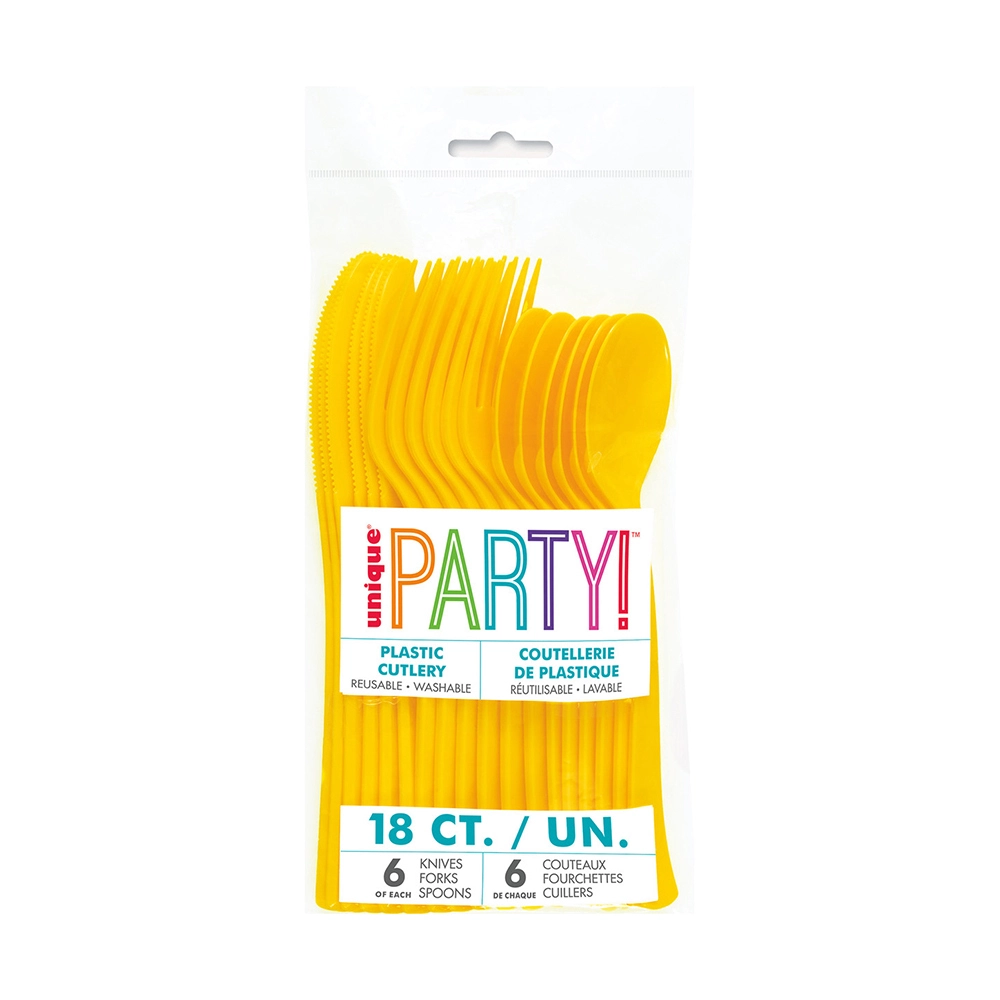 Includes 18 Sunflower Yellow Cutlery Contains: 6 x spoon 6 x fork 6 knife High-quality Perfect accessory for your theme parties Coordinate with other Birthday party supplies and party decorations